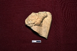 | Description / विवरण | A terracotta plaque depicts the left arm of a male figurine, positioned on his left waist while holding the waist belt. The arms are adorned with thick bangles, and a portion of the waist belt is shown, decorated with beaded design. |