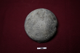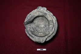 | Description / विवरण | This terracotta lamp is circular in shape, but the wick is broken. It has a black slip treatment, a straight rim with a three-tier design, and a flattened upper part adorned with dotted decorations. The surface is smooth, and the base is rounded. |