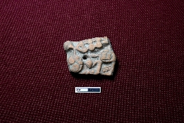 | Description / विवरण | A terracotta plaque depicts decorative items with circular designs connected by lines. A perforation is present for hanging purposes. |