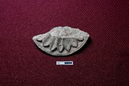 | Description / विवरण | A half-broken terracotta plaque, red in color, features floral decorations with jagged edges. |