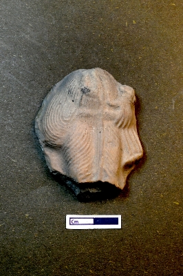 | Description / विवरण | A fragmented terracotta plaque showing a male figurine. The left hand is rested on the waist, and a bangle can be seen on the left wrist. The object is covered with folded drapery. |
