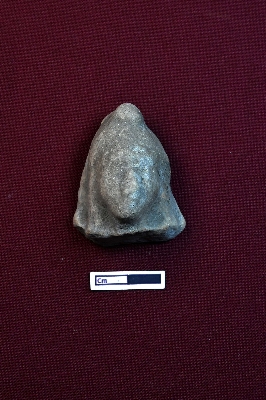 | Description / विवरण | A terracotta plaque showing the head of a human figurine. The facial expression is partly visible. A hair knot, often referred to as matted hair, is visible on top of the head. |