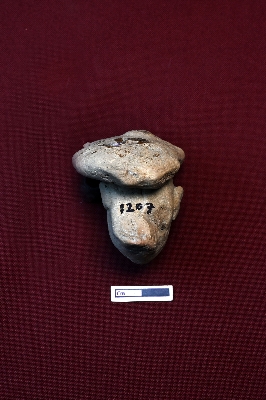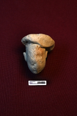 | Description / विवरण | A terracotta head of a male figurine. The facial expression is unclear, but the ears are visible. A stylish, hat-like object is placed on top. |