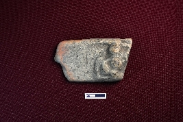 | Description / विवरण | A terracotta plaque showing a mother and child scene. Both figurines are placed on the left side of the plaque. The figurines are partly damaged. |