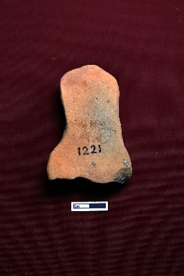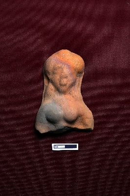 | Description / विवरण | A terracotta plaque shows an intact female figurine from the top to the upper part of the belly. The facial expression is partially visible large mouth and thick nose. |