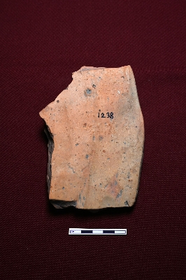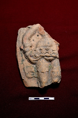 | Description / विवरण | A terracotta plaque displaying a highly ornamented fragmented female figurine. The right hand is adorned with three decorated wristlets, and a waist belt with beaded decoration is visible. Both legs are wrapped in decorated cloth. |