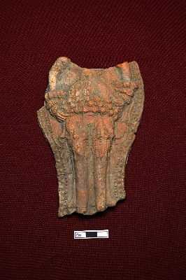 | Description / विवरण | A terracotta plaque depicting a partially broken female figurine, highly ornamented. Both hands are adorned with three thick bangles. A waist belt is visible, decorated with a three-tier beaded design. Several chain-like objects with small ball decorations cover both thighs. Beaded decoration can also be seen along the edges of the object. |