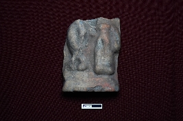 | Description / विवरण | A terracotta plaque features two human figurines. The one on the right is half broken and stands in a crossed-legged position, while the left figurine is female with a broken head. Her left hand is partly visible, and both figurines are standing on a pedestal-like object. |