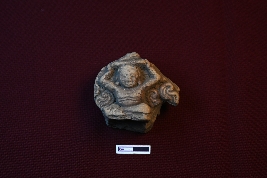 | Description / विवरण | A terracotta plaque showcasing a male figurine in a seated posture. He is holding an object in his hand, placing it on top of his head. The face is somewhat unusual, with a large mouth, a big nose, and circular eyes. The edges of the plaque are decorated with a design. |