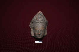 | Description / विवरण | A terracotta head of a female figurine. The facial expression is fully visible, and a well-decorated conical headgear is placed on top. This is the head of a female deity. |