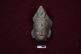 | Description / विवरण | A terracotta head of a female figurine. The facial expression is fully visible, but some damage is evident. A well-decorated conical headgear sits on top, although it is slightly broken. This is the head of a female deity. |