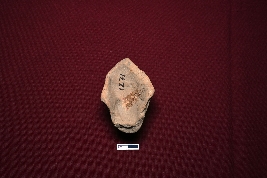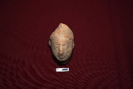 | Description / विवरण | A terracotta head of a human figurine. The facial expression is partially visible, with a thick nose and eyes. |