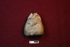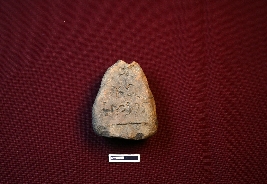 | Description / विवरण | A terracotta seal with a three-line inscription in Proto-Bengali script. On the reverse, three circular depictions are visible. The object is almost triangular shaped. |