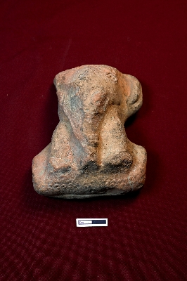| Description / विवरण | This terracotta toy is designed to resemble a decorated elephant figurine. Intricate decorations adorn the face and the base of the object. Face is partly visible and front legs are identified. There is a hole in the back for hanging purposes. |
