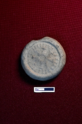 | Description / विवरण | A circular terracotta seal with a slightly broken edge. A circular depiction is placed at the center of the object. Lines radiate outward from the circular depiction. The outer part is encircled with parallel circular lines, and inside these lines, designs are depicted. |