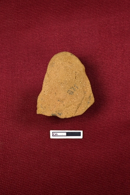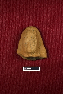 | Description / विवरण | A terracotta plaque displays a human figurine, with only the face visible. The figure has folded eyes, and the nose is partly visible. |