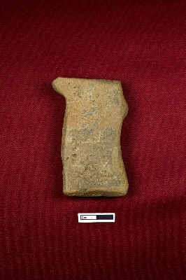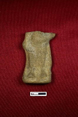 | Description / विवरण | A terracotta plaque depicts a human figurine, with only the lower part visible. The left hand is placed on the left waist, and the right hand rests on the thigh. The figurine has a swollen belly. |