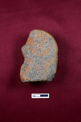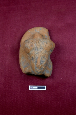| Description / विवरण | A terracotta plaque depicting a human head with a turban, though the face is heavily mutilated. |