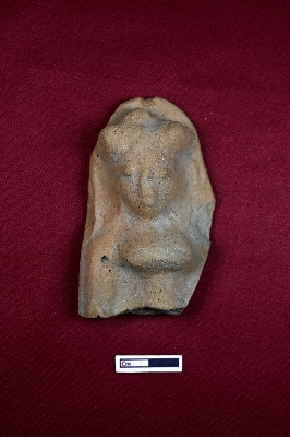 | Description / विवरण | A terracotta plaque showing the upper part of a female figurine with a turban. The facial expression is fully visible. |