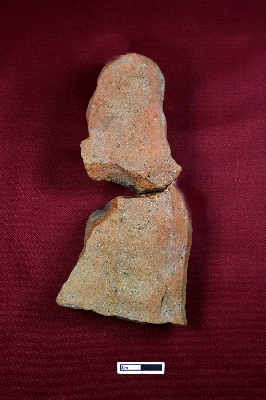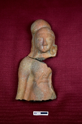 | Description / विवरण | A terracotta plaque representing a female figurine wearing a turban and earrings, with a completely visible facial expression. A dagger is tied to her waist belt. |