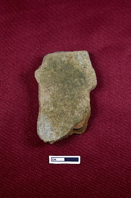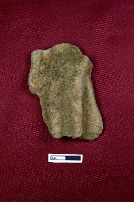 | Description / विवरण | A broken part of a terracotta plaque depicting a figurine in a standing position, with only the lower part visible. |