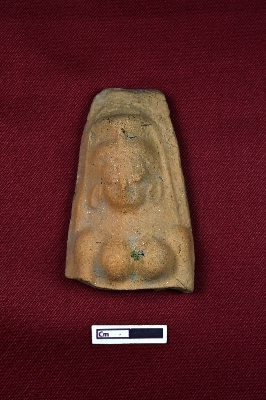 | Description / विवरण | A terracotta plaque representing a female figurine with closed eyes. She wears earrings and a turban on her head and her facial expression is visible. The object is intact from the top to the breast. |