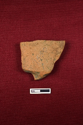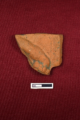 | Description / विवरण | Probably a broken part of a terracotta plaque showing a hand decorated with armlet and holding an unidentified object. |