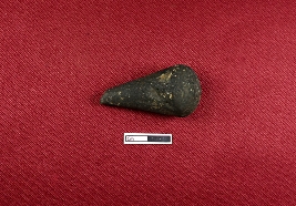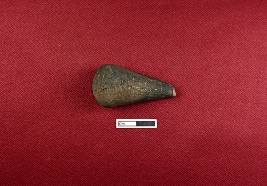 | Description / विवरण | With a partly broken top and rounded bottom, this terracotta stopper has a near-conical form. The object is smooth and black. |