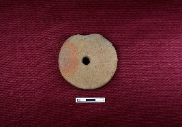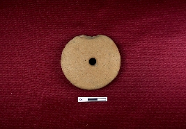 | Description / विवरण | A terracotta wheel of a toy cart which is red in colour with smooth surface. A perforation is there in the middle. Edge is slightly broken |