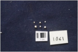 | Description / विवरण | 6 cylindrical micro beads with a central preforation made of steatite, surface is smooth |