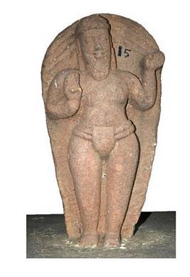 | Description / विवरण | Standing image of a sage Rishi with dishevelled hair and long flowing jatas on either side. The right hand is raised and kept in abhaya-mudra while the left is raised upwards and kept open with folding thumb. The waist is adorned with a katibandha covering the private parts. He has long beard in conical fashion. |