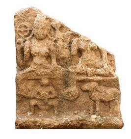 | Description / विवरण | Broken saptamatrika panel. Only two deities are seen. The left one is Viashnavi seated cross legged holding a disc and a conch in the two rear hands. The lower right hand is in abhaya-mudra, while the right lower rests on the lap. Below is the vehicle Garuda. The face of the right one and the hands are broken. To her right is seated consort of Yama, face is broken, below is the vehicle buffalo. |