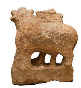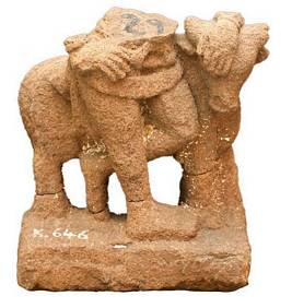 | Description / विवरण | Broken image of Krishna leaning to the body of cow standing to the right with the face turned front wards. The standing Gopal is seen cross legged. There is a wide patta broad belt which runs around on the front side above the lap. Part of the palm of the left hand rests on the head of the cow, where as the right hand rests on the waist. Upper portion is broken and missing. |