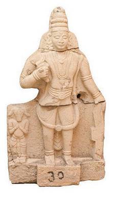 | Description / विवरण | Standing image of Virabhadra broken , flanked by Daksha on the right side. The head is adorned with three tiered karandamakuta. The ears are ornamented with patra and makarakundalas. The figure is profusely ornamented. There is also a four stranded katisutra with a circular pendant in the centre. The right hand is bent towards left and slightly raised upwards holding the horn of the goat, where as the left hand hangs down holding a sword. A small dagger is seen prominently on the side of the waist. |