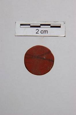 | Description / विवरण | Flattened round shape object in red colour.Two crack marks are crossing each other in middle portion. Tiny spots are also noticeable on surface. |