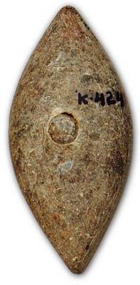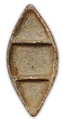 | Description / विवरण | Boat shaped bowl made in soft stone having three portions created by two partitions, a circular prominent groove on the ventral side. |