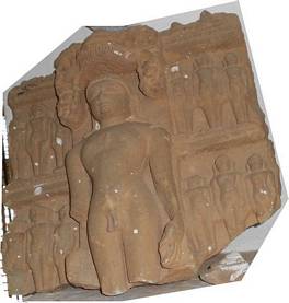 | Description / विवरण | The Jain Tirthankara is seen standing in Kayotsarga mudra.His body is erect and appear to be motionless with half close eyes which show a beautiful meditative expression. His curly hair has a Usnisa over his head. Flying gandharva and elephant figures are depicted on either side of Chhatra. Above his head Chhatra is shown. Six standing jina figures are depicted on either side of deity. His legs are broken.Srivatsa symbol is visible on the chest.The image pedestal has no inscription, but on iconographic ground it can be ascribed to 12th century AD. Sculpture is identified as Jain Tirthankara on the basis of art style. |