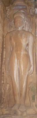 | Description / विवरण | The Jain Tirthankara is seen standing in kayotsarga mudra on a pitha.His body is erect and appear to be motionless and half close eyes which show a beautiful meditative expresion.His curly hair has a usnisa over his head.The figure of a standing camardhari is depicted on either near his legs.Above his head chhatra is shown.Behind the halo is shown. Srivatsa symbol is visible on the chest.The image pedestal has no inscription on the pitha but iconographic grounds it can be ascribe of circa 8th century AD.His lanchhan emblem is absent on the pitha, this image is identified as jain tirthankara on the basis of art stlye |