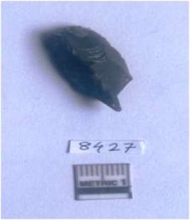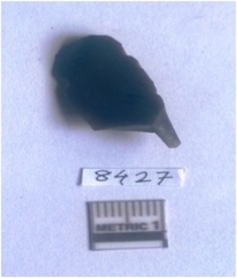 | Description / विवरण | This is a jasper stone, the piece is resembles a blade with rounded pointed end. The other end has a sharp pointed end like a holder. Bulb of percussion seen on one side and flakes removed from the other side with ripples. |