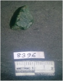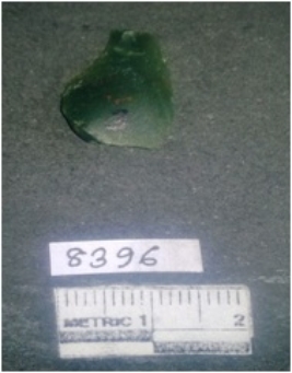 | Description / विवरण | Moss agate is translucent green in colour with reddish dots, very sharp edges and bulb of percussion seen on the ventral side with ridges on the dorsal side. One edges shows denticulate marks. |