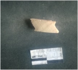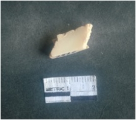 | Description / विवरण | The shell circlet fragment has angular edges and incomplete finish. The pieces pale white in color, and has rectangular cross section. The outer faces are rough while the inside edge has natural polish. |