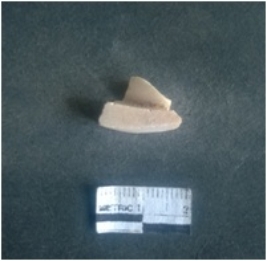 | Description / विवरण | The shell circlet fragment has angular edges and incomplete finish. The pieces pale white in color, and has rectangular cross section. The outer faces are rough while the inside edge has natural polish. |