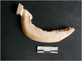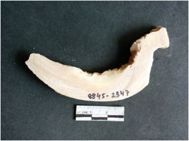 | Description / विवरण | This is a fragment of an unfinished shell circlet. It is an unfinished bangle fragment. It is white in color with polished inner surface and grounded outer surface. Rectangular in cross section. |