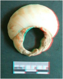 | Description / विवरण | This is fragment of chank roundish with a whole on side, due to the natural shape of the shell. Very fine cut marks seen on one side, possibly a waste piece after the removal of needed portion. |