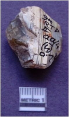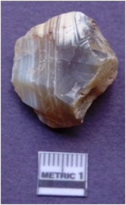 | Description / विवरण | It is a banded agate, covered with cortex. Few flakes are chipped of from the fragment. |