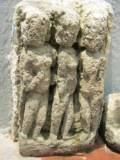 | Description / विवरण | Three standing female figures in a row. All are naked and having bun hair design. Only one figure is having two hands while other two are in profile. Only one hand is visible. Long ear and breasts are prominently carved. |
