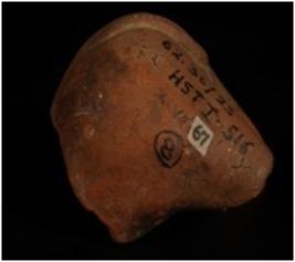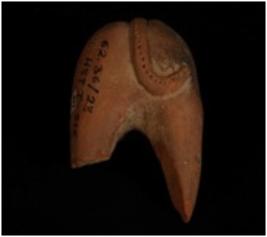 | Description / विवरण | Hind portion of animal figurine. Tail is intact with applique design and small pin hole design throughout the tail, tail turned upward legs are broken. |