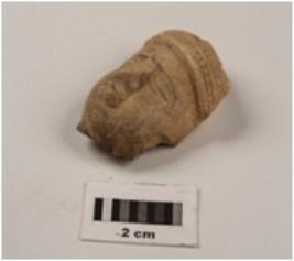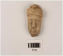 | Description / विवरण | Stucco male head with angular eyes, broken nose, thick lower lip, missing ears and a decorated headdress. |