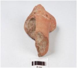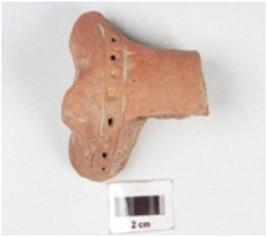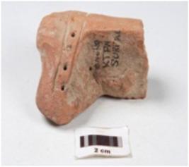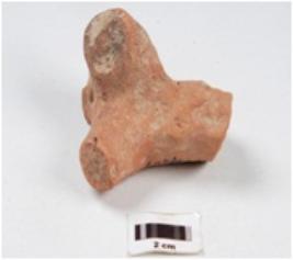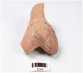 | Description / विवरण | Fragment of a terracotta bull figurine, partly of body and hind limbs are present, tail made by applique design, saddle marked by paralllel horizontal grooved lines and dots in between them and surface treated with slip in red colour. |
