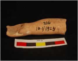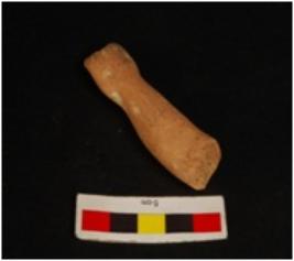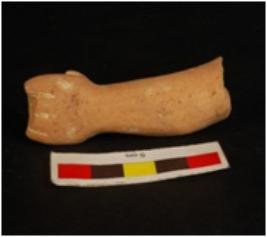 | Description / विवरण | Terracotta human arm, plain surface, fingers are suggested by incised lines, thump and top of fingers are broken and buff in colour. |